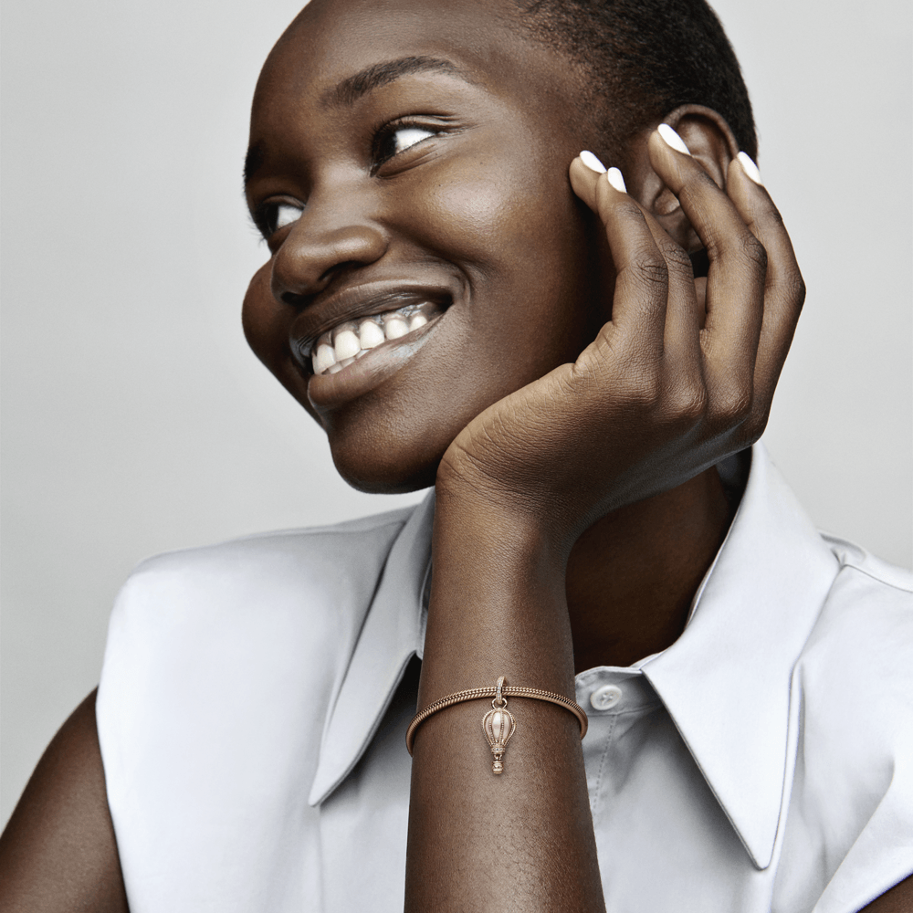 Alcance novas alturas com o Charm Pendente Balao De Ar Quente Rosa Brilhante. Este charme de tons quentes é finalizado à mão em banho de ouro rose 14k. Cordas de contas envolvem um cristal rosa de conto de fadas acentuado por zircônia cúbica transparente brilhante. A alça e a base do balão são embelezadas com pavé brilhante. Abaixo, uma pequena gôndola aguarda para transportá-lo ao seu destino. Use-o para inspiração diária ou presenteie alguém que esteja pronto para sua próxima aventura.
