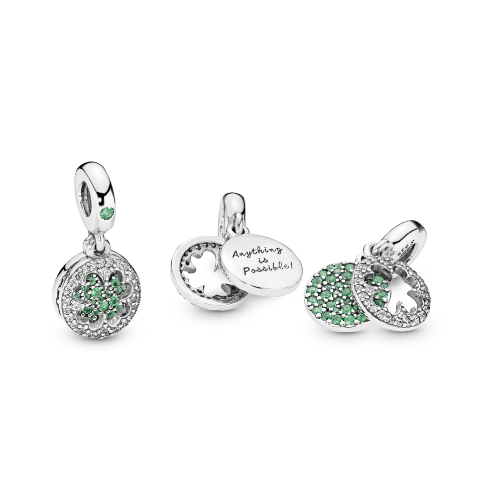 Sinta-se sortudo todos os dias com este brilhante amuleto da sorte o Charm Pendente Tudo É Possível. Enfeitado com zircônia cúbica transparente e cristais verdes, ele traz significado ao seu visual e sorte à sua vida. O pingente de prata esterlina é centralizado com um trevo de quatro folhas. Use-o em sua pulseira Pandora Moments como um símbolo de sua história ou presenteie alguém especial como um amuleto da sorte.