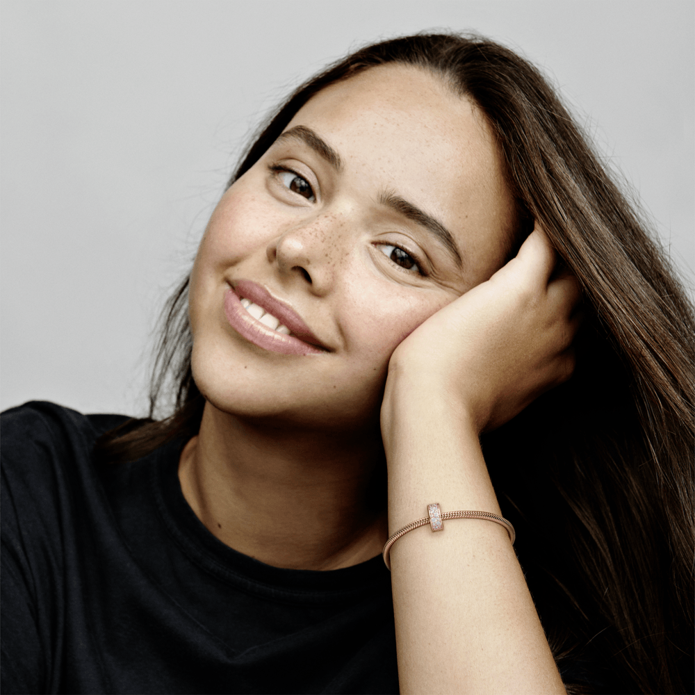 O Charm Caminho Elegante da Pandora adiciona um toque de luz e organização ao seu bracelete. Com banho em ouro rosé 14k, a peça apresenta duas delicadas fileiras de zircônias cúbicas rosa, além de ser um charm com fechamento clipe e uma joia separadora de charms. Ideal para criar composições equilibradas e valorizar a narrativa do seu bracelete Pandora.