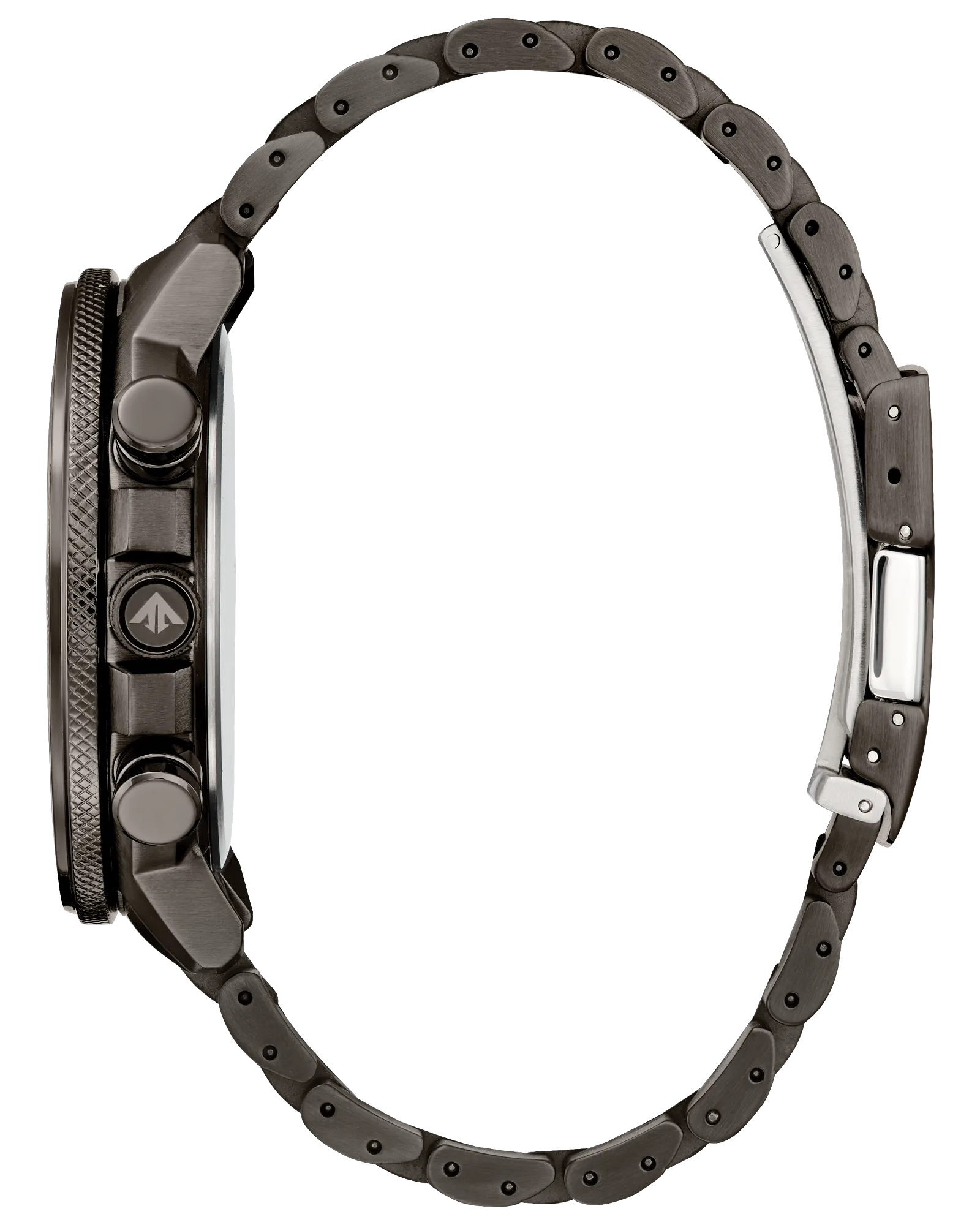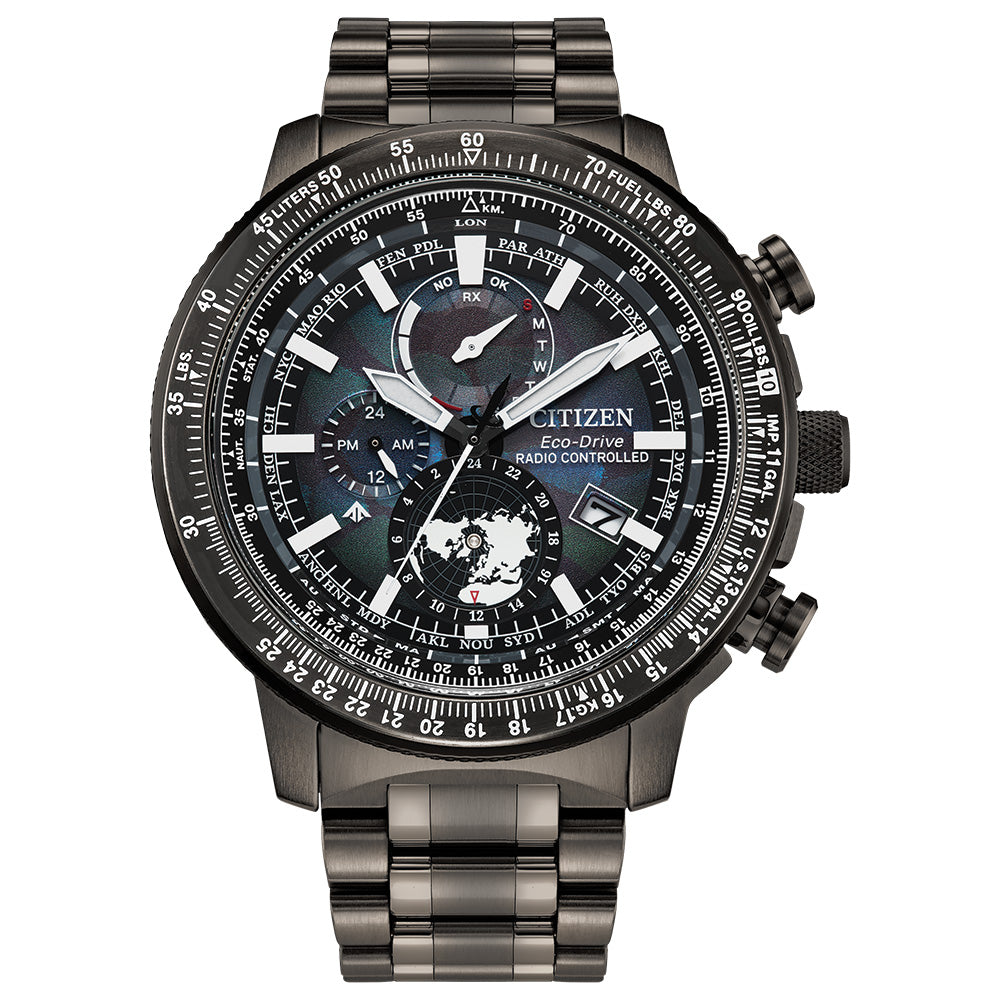 A robusta caixa de 46mm em aço inoxidável cinza escuro confere presença marcante ao design, com recursos profissionais de relógio de piloto, incluindo botões de cronógrafo destacados, pulseira de cinco elos em aço e bisel externo com escala deslizante.