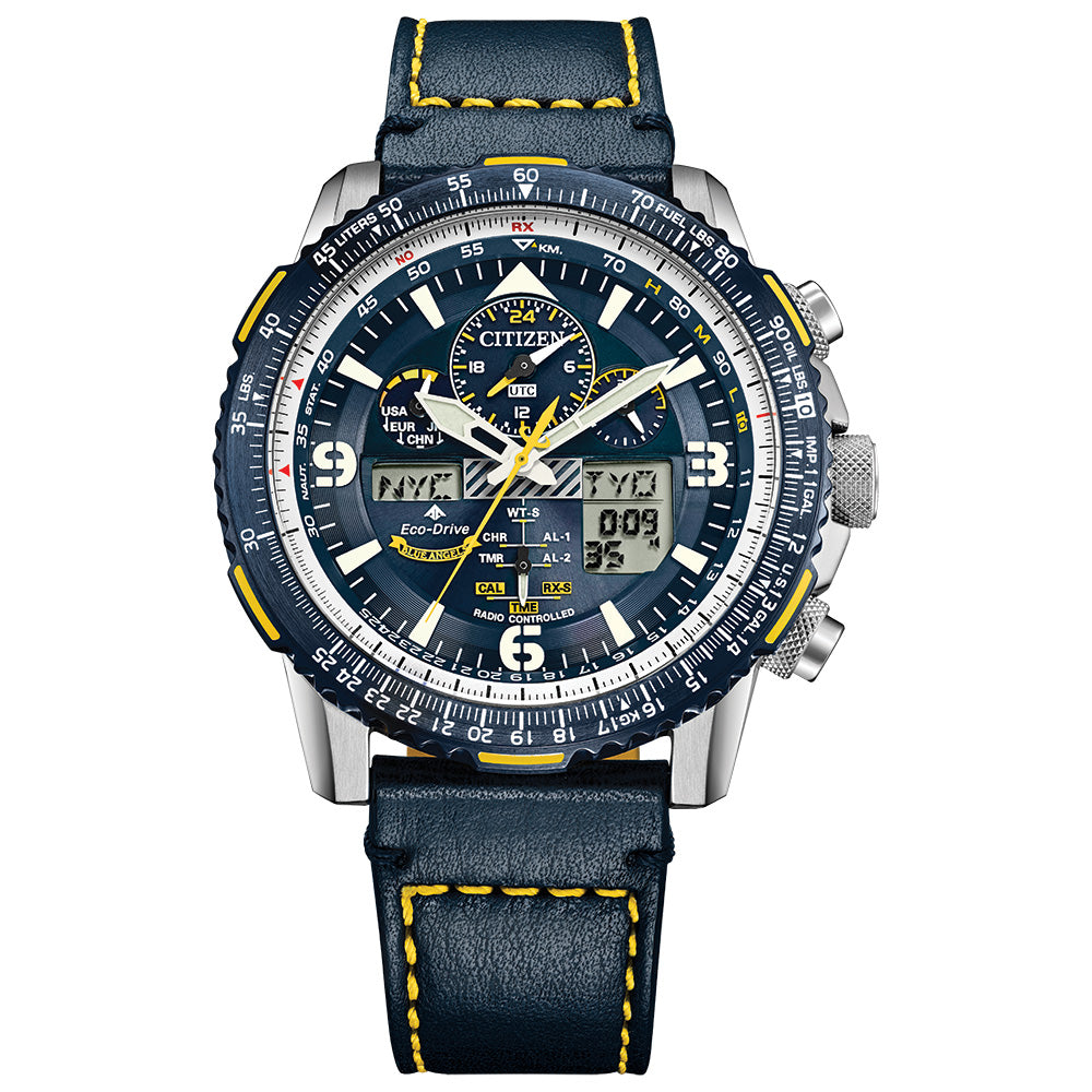 Os Blue Angels são a esquadrilha de demonstração de voo da Marinha dos EUA, renomada por sua precisão e elegância em cada manobra. Essa mesma precisão é refletida no relógio Citizen Promaster Blue Angels Skyhawk A-T, com cronometrista atômico em 43 cidades.