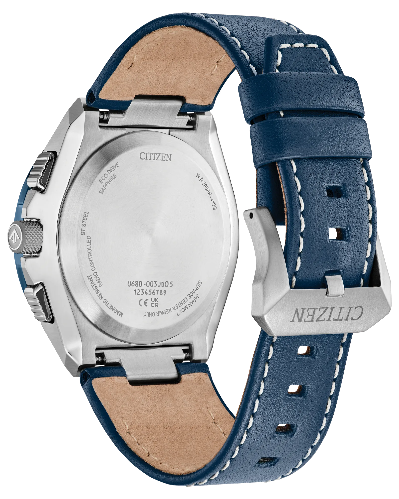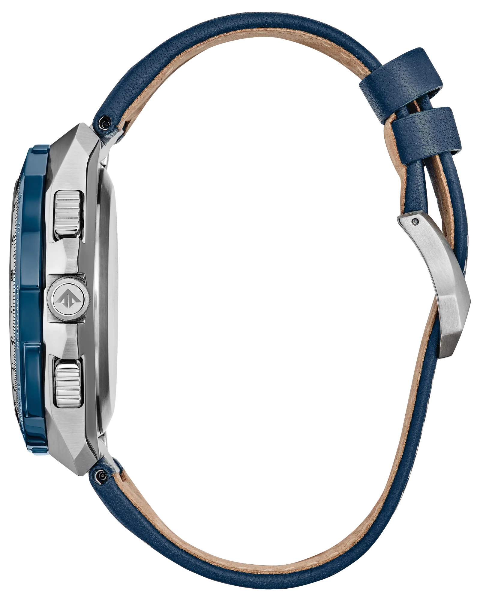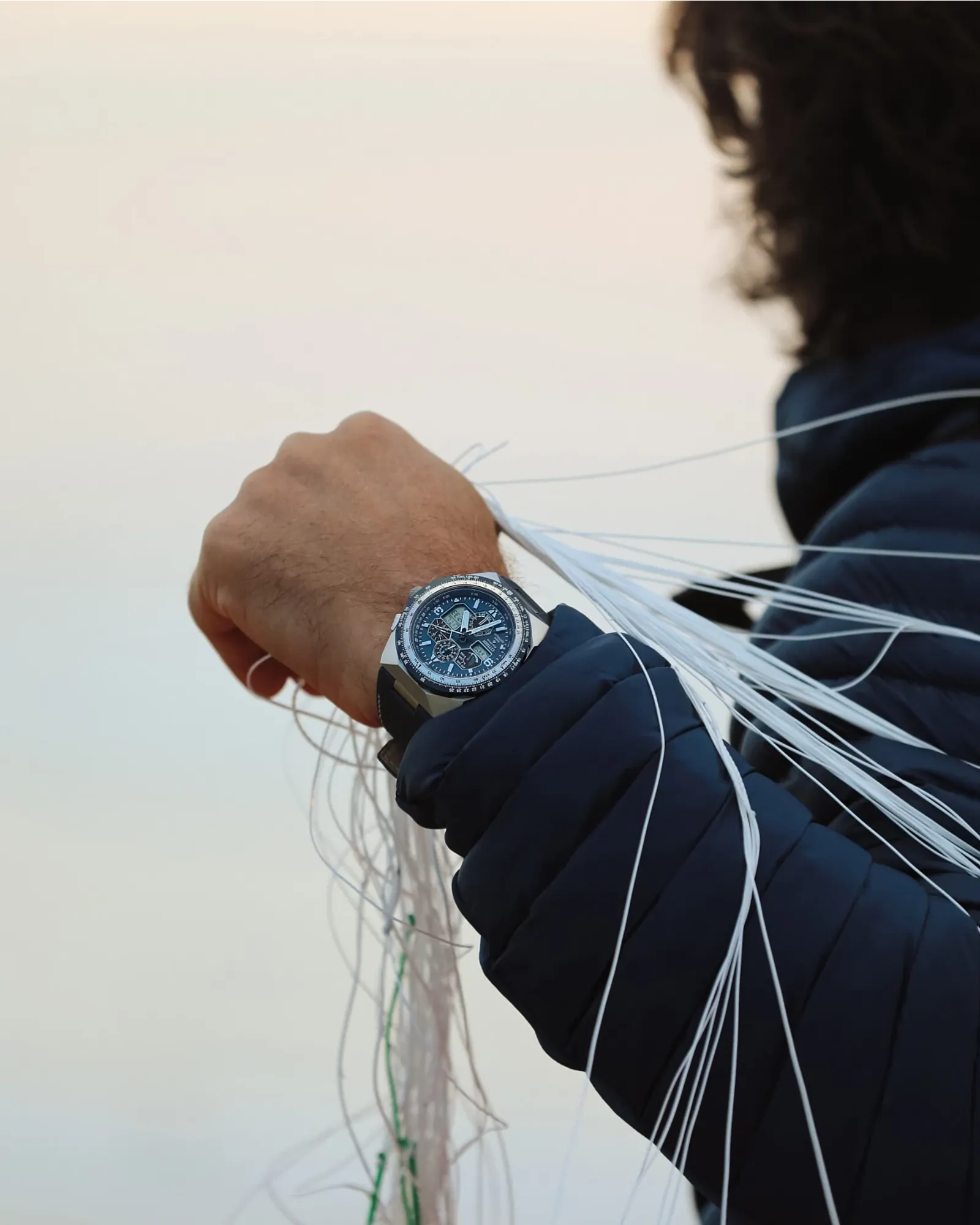 Sob o vidro de safira resistente a riscos, o mostrador azul combina detalhes em branco e prateado com elementos analógicos e digitais, criando a estética única e a alta funcionalidade do Skyhawk.