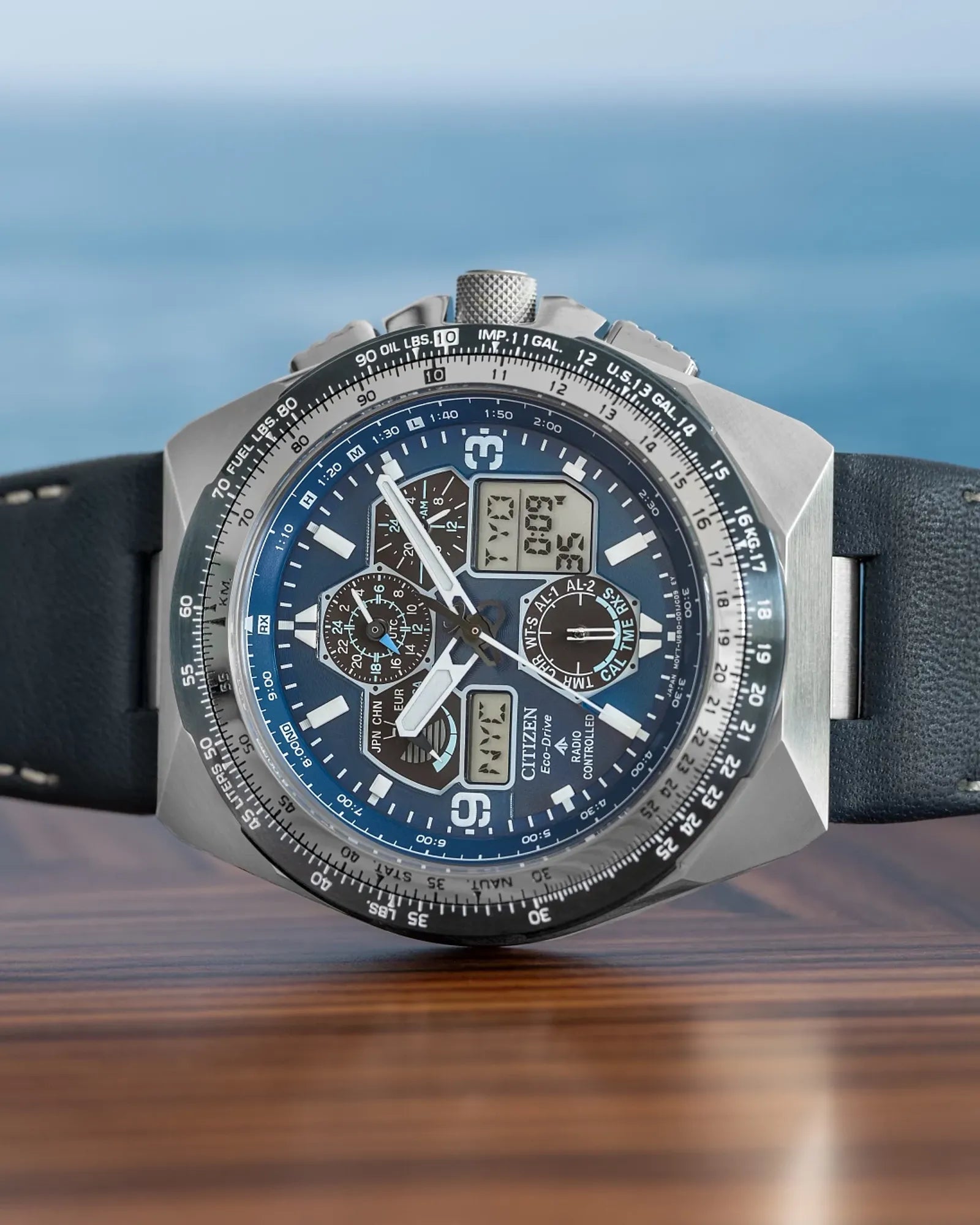 Alcance novos patamares de estilo e desempenho com o relógio Promaster Skyhawk A-T. Este cronógrafo indispensável apresenta caixa em aço inoxidável prateado e mostrador azul hipnotizante, com 46mm de presença marcante, preso ao pulso por uma pulseira de couro azul combinando.