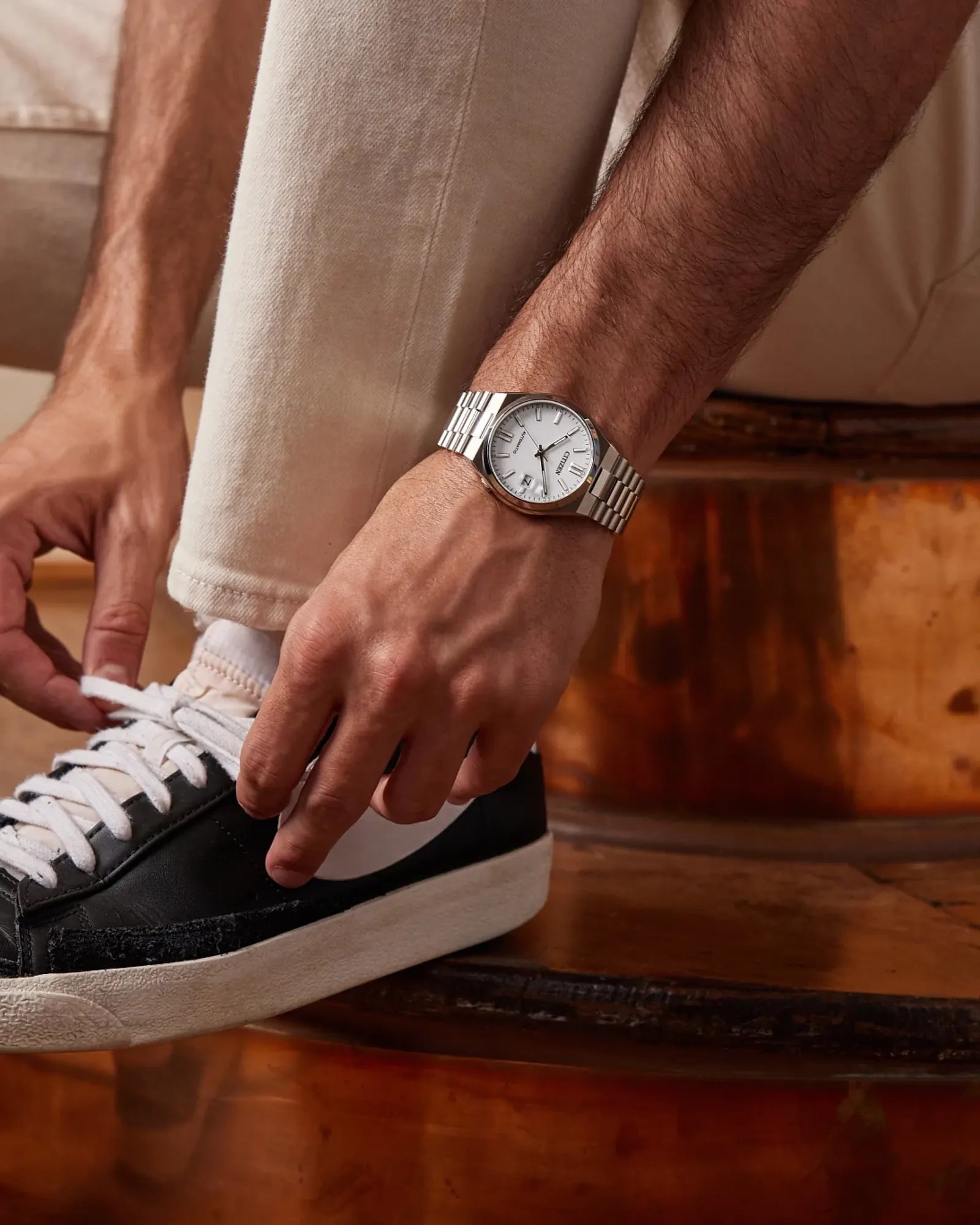O relógio Tsuyosa Automatic, da série NJ015, traz um estilo esportivo ultramoderno diretamente para o seu pulso. Com caixa de 40mm em aço inoxidável prateado e pulseira integrada combinando, o design sofisticado garante presença marcante.