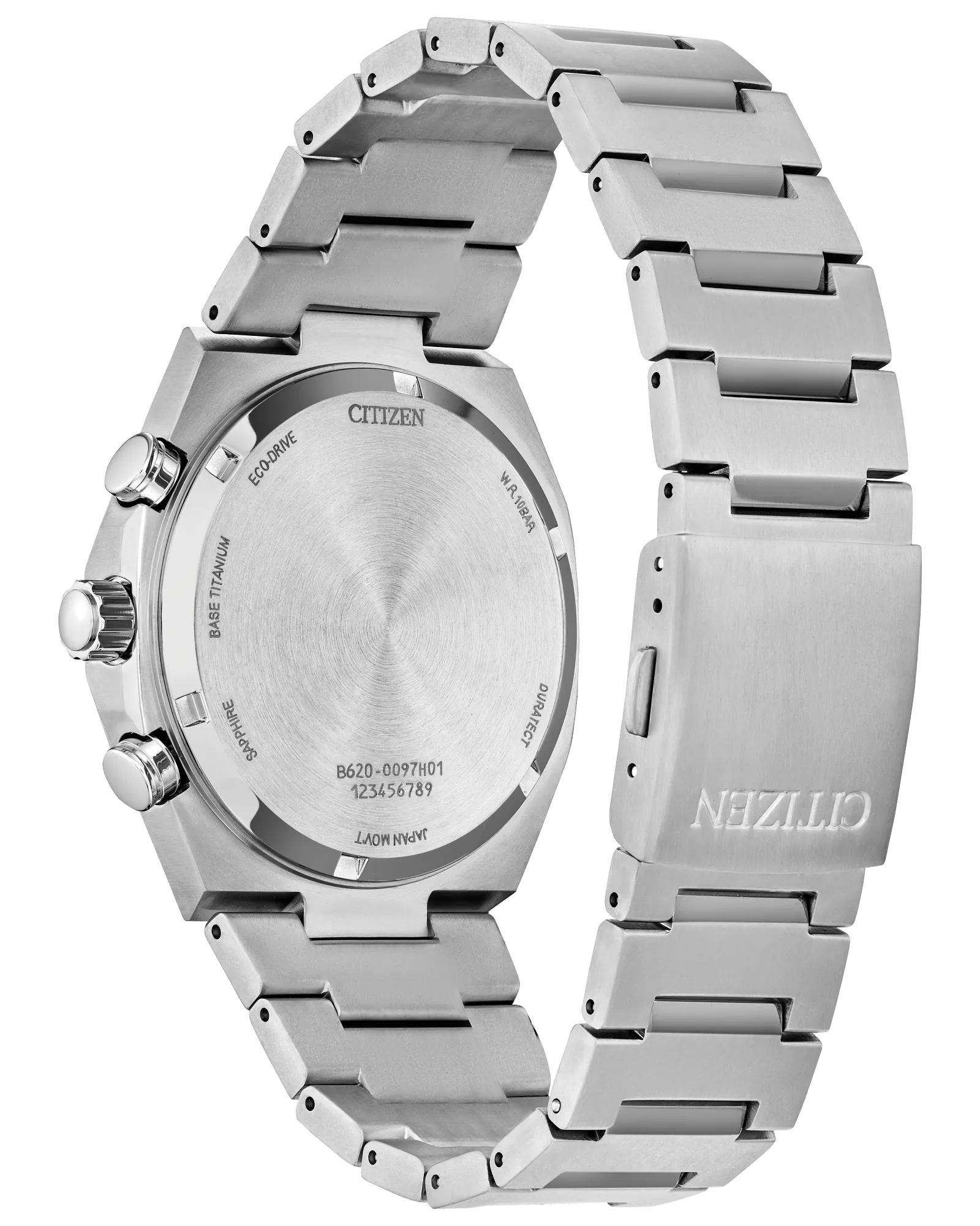 Unindo proporções clássicas a um estilo moderno, apresentamos a nova série Integrated Super Titanium™ da Citizen. Com caixa de 42,5mm em Super Titanium™ prateado, botões de cronógrafo escalonados e coroa estilizada, o relógio possui acabamento refinado entre escovado e polido, e é preso ao pulso por uma pulseira integrada combinando.
