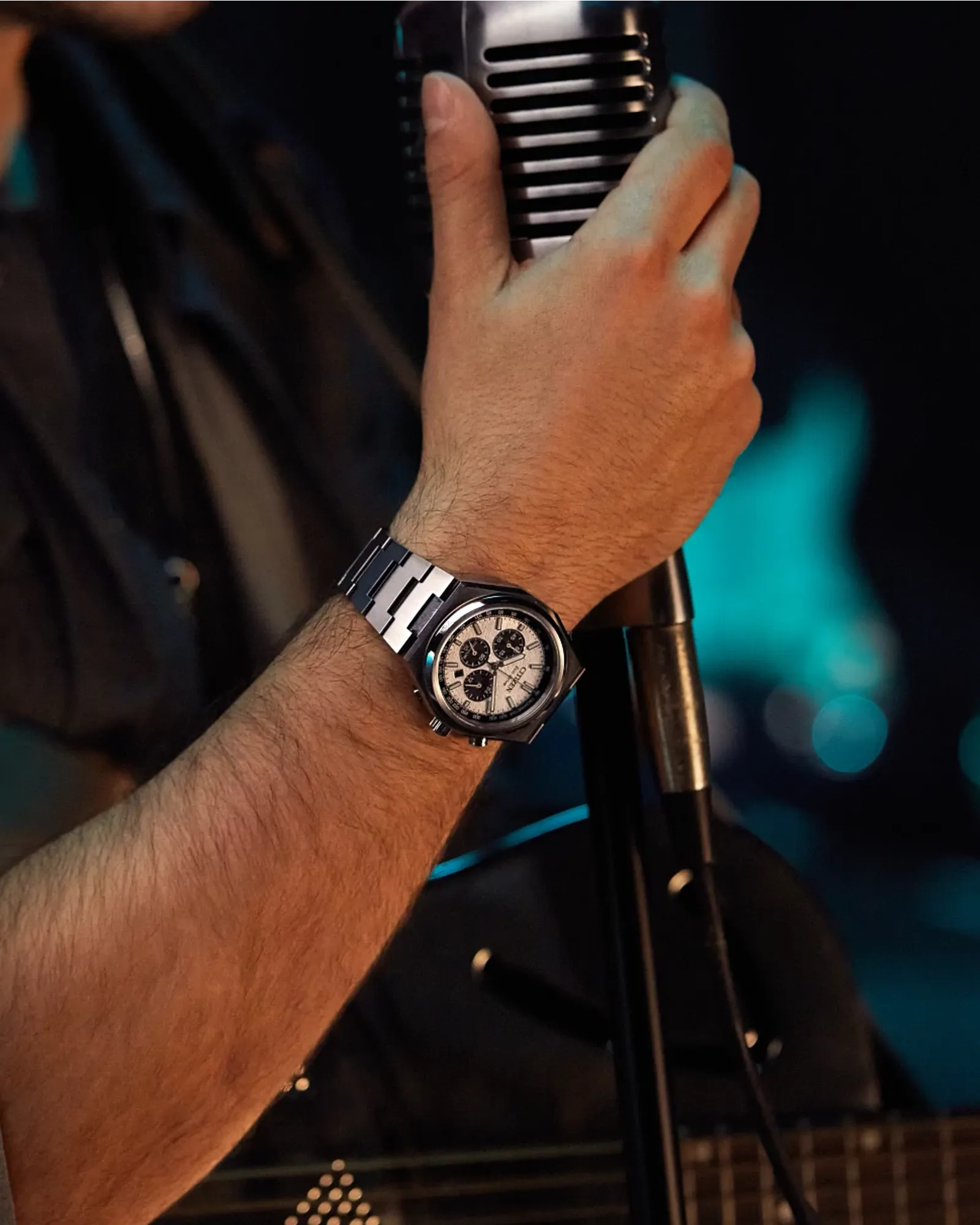 O mostrador prata texturizado é complementado por escala taquimétrica externa, configuração de três contadores preto e detalhes em prateado e branco no ponteiro e índices aplicados. Entre suas funções estão horas em funcionamento contínuo, cronógrafo com divisão de segundos, exibição 12/24 horas e data.